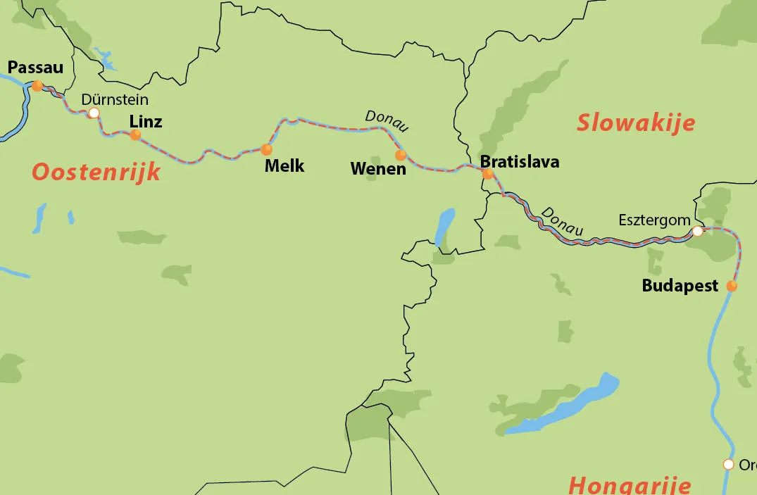 Rivierscruises DonauDe Donau is met recht het ‘neusje van de zalm’, want als enige grote rivier van Europa die van het Westen naar het Oosten stroomt, doorkruist zij maar liefst tien verschillende landen. Elke dag is een nieuw hoogtepunt wanneer u kiest voor een cruise over de Donau. U heeft nog maar net de ‘drierivierenstad’ Passau verlaten of de eerste onvergetelijke excursielocaties dienen zich al aan in de vorm van de majestueuze abdijen van Sankt Florian en Melk. Vanaf hier ontvouwt zich de idyllische Wachau-vallei. Te midden van de met eeuwenoude, steile wijnterrassen bedekte heuvels, omgeven door grillige rotsformaties en mysterieuze loofbossen, proeft u in Linz de beste lokale producten van de regio. De combinatie van de architectuur, de muziek en de romantische sfeer in het Oostenrijkse Wenen maken uw bezoek tot een waar sprookje. Zestig kilometer verderop prijken aan de Donau de historische monumenten van Bratislava. De Donau cruise is niet compleet zonder een uitgebreide kennismaking met het prachtige Boedapest, waar de ‘koningin van Europa’ wordt geflankeerd door het fenomenale parlementsgebouw aan de ene kant en Castle Hill met de indrukwekkende burcht van Boeda en het Vissersbastion aan de andere kant. Heel anders is de Hongaarse Puszta, waar een paardenshow en koetsrit u de ultieme plattelandsbeleving geven. Gaat u mee?